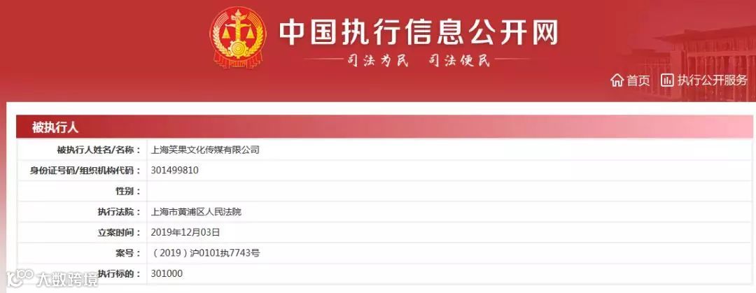 日前,中国执行信息公开网信息显示,上海笑果文化传媒有限公司被上海市黄浦区人民法院列为被执行人,执行标的为30.1万元,立案时间为12月3日。