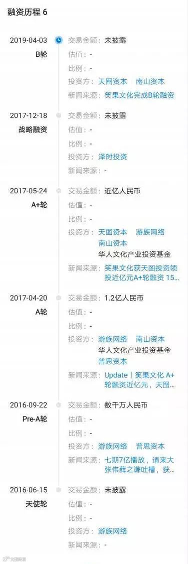 通过企盾宝查询显示,2016年至今,笑果文化已经历了6轮融资,其中王思聪的普思资本参与了2016年9月的Pre-A轮融资及2017年4月的A轮融资。据媒体报道,王思聪曾评论《吐槽大会》称:“我认为这是年轻人喜欢的喜剧表现形态,也是我看好的喜剧消费升级的方向。”而最近一轮融资发生在今年4月。据企盾宝信息,该公司已完成一轮工商变更,注册资本金从183万元增加为189万元,新增投资人南山星曜和天图东峰,两者均为笑果上一轮融资的老股东。经过此次B轮融资,业内人士对笑果文化的估值已达30亿元。