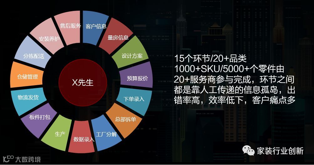 从复杂性角度看,整装涉及家居行业全品类供应链,客户要完成一个“家”需要至少15+以上的环节,1000+SKU产品,5000+零部件,完成这些环节需要20+品类的服务商。