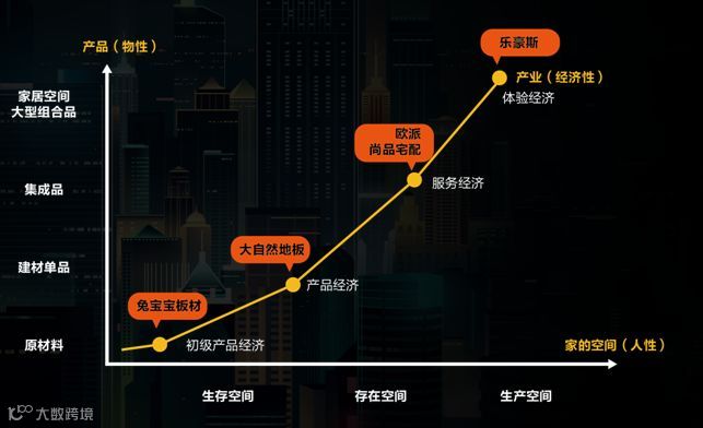 纵坐标讲的是家居产品发展路径,从刚开始的原材料需求→建材单品发展→集成品(全屋定制家具)蓬勃发展,下一步就会发展到家居空间大型组合产品(整装产品),在菲利普·科特勒的经典巨著《营销管理》里也预测了组合产品的发展。