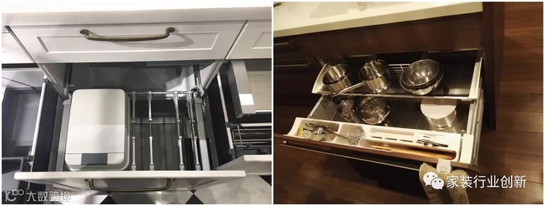背景厨房抽屉收纳系统分区紧凑合理,上层大下层小的格局便于快速查看物品。抽屉的面板是可以向外倾斜的构造,方便主妇用更舒适的姿势取放物品。