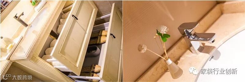 背景卫生间收纳系统设计让洗手台、梳妆台前的生活程序变得井井有条,柜体及收纳空间同样也延续空间高效利用的宗旨。