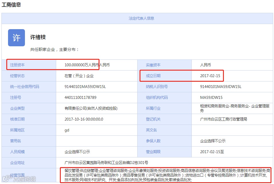 据企盾宝资料显示,“茶颜观色”品牌的主体公司为广州洛旗餐饮管理有限公司。公司法人代表为许绪枝,公司注册资本为100万人民币,公司成立时间稍早于湖南茶悦餐饮管理有限公司,成立于2017年2月15日。公司第一股东为许绪枝,占股60%,第二股东为丁泉,占股40%。