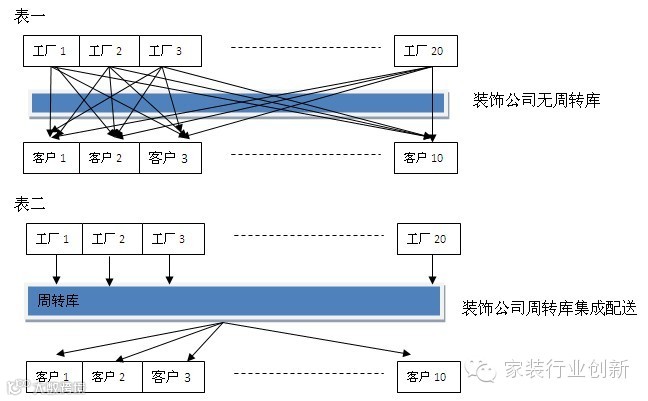 再看由家装公司设立周转库这种模式(表二),工厂依旧可以根据需求周单发货或者下线检验完毕就发货,所有订单产品均到周转库进行周转,由管理员按户进行分拣,市内配送时间均按照工地进度需求节点集成配送,正常情况下,基础装修环节集成配送瓷砖、马赛克,待基础装修验收后,主材安装环节集成配送壁纸、地板、洁具五金、吊顶电器,木制作产品等,待主材安装验收后,最后配送成品灯饰、活动家具、窗帘等软装饰产品,这样可以节省二次配送的费用,还可以灵活的跟工地进度相配合,装饰公司的控制力强。