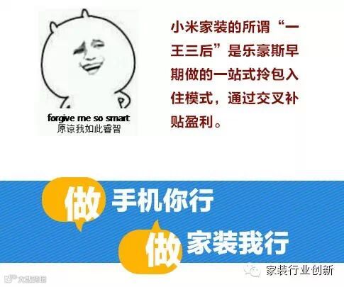 把这些概念东拼西凑出来,不知小米用了多久,但是,这些充其量只能算是互联网的家装1.0版本:平米报价、三不限、无增项、超短工期、网络营销、饥渴营销、样板间实景体验、手机看工地等等,这些早在五六年前,乐豪斯就已经在做了。