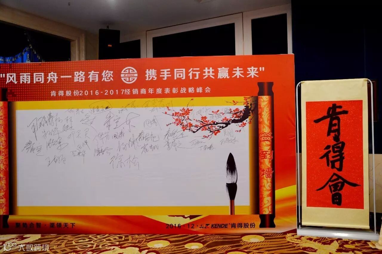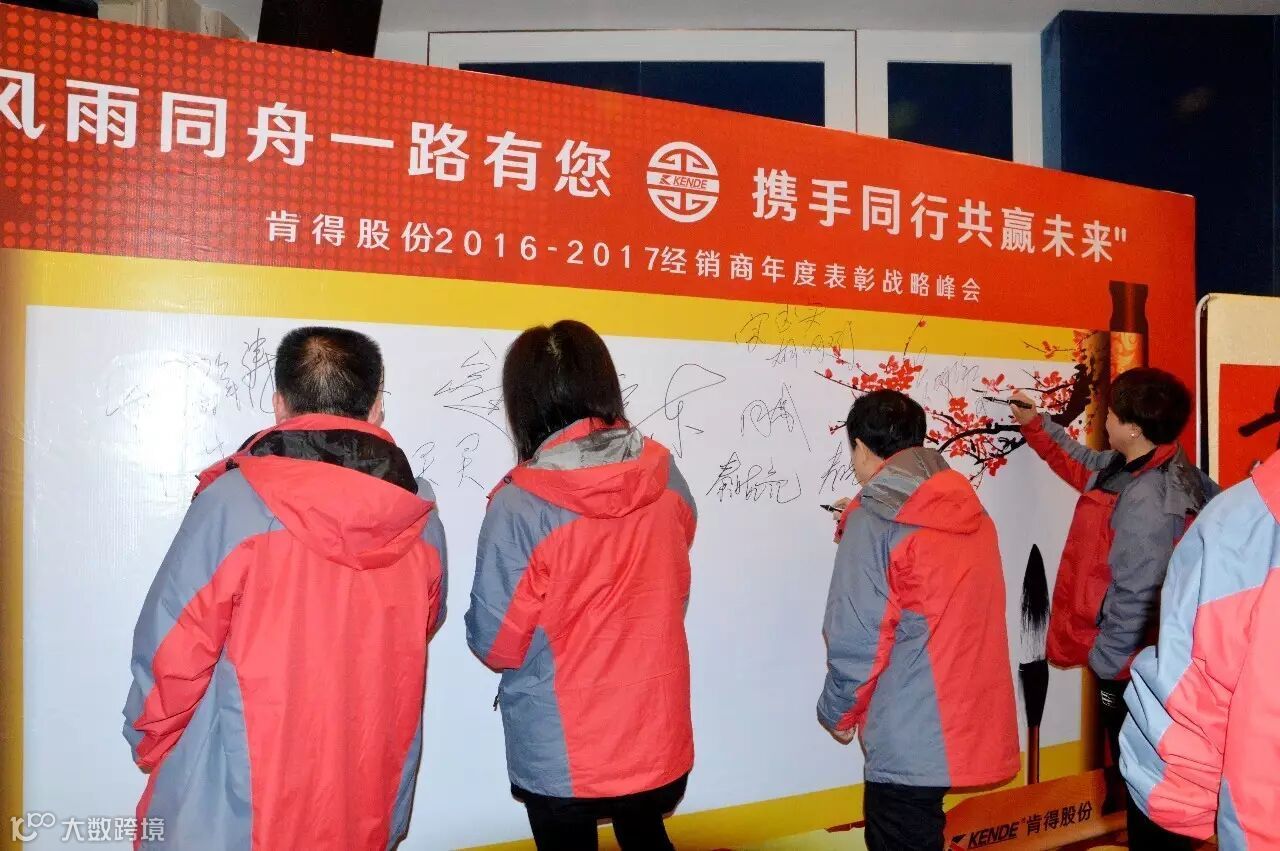 下午1时许,全国各经销商代表参加肯得股份2016-2017年度经销商表彰战略峰会颁奖盛典。由公司董事长朱宣东先生率先在肯得股份2016-2017年度经销商表彰战略峰会签名墙上签字,各经销商代表也纷纷在签名墙上留名。