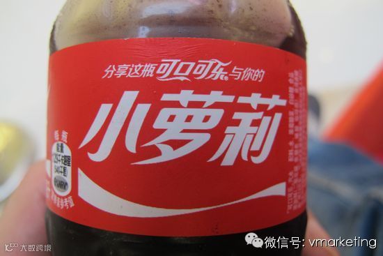 2013年的夏天,仿照在澳大利亚的营销动作,可口可乐在中国推出可口可乐昵称瓶,昵称瓶在每瓶可口可乐瓶子上都写着“分享这瓶可口可乐,与你的_________。”这些昵称有白富美,天然呆,高富帅,邻家女孩,大咔,纯爷们,有为青年,文艺青年,小萝莉等等。这种昵称瓶迎合了中国的网络文化,使广大网民喜闻乐见,于是,几乎所有喜欢可口可乐的人都开始去寻找专属于自己的可乐。