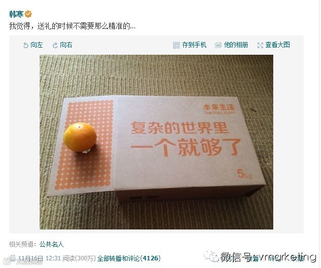 本来生活的褚橙营销走的是幽默的内容营销路线。在预售期内,本来生活网站就推出一系列个性化包装,那些印有“母后,记得一颗给阿玛”、“虽然你很努力,但你的成功,主要靠天赋”、“谢谢你,让我站着把钱挣了”、“我很好,你也保重”等幽默温馨话语的包装箱,推出没多久就在本来生活网上显示“售罄”,可见其受欢迎程度。