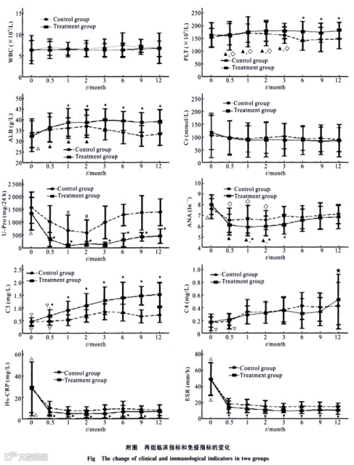 结果:经过12个月的干预,两组患者的24小时尿蛋白定量、抗核抗体水平、高敏C反应蛋白、血沉和狼疮活动指数均较干预前有所下降(P<0.05),且干预组的下降幅度显著低于对照组(P<0.05)。此外,两组患者的白蛋白(ALB)和补体(C3、C4)水平在干预后均有升高,而干预组的ALB和C3水平显著高于对照组(P<0.05)。
