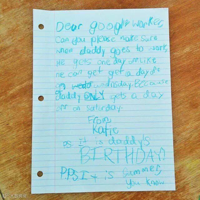 这封信是一个叫凯蒂的小女孩用蓝色蜡笔写的:“亲爱的谷歌员工,求求你能否让爸爸在周三休息一天,因为他只有周六才放假。对了周三是我爸爸的生日,而且现在是适合放假的夏天,你懂的”