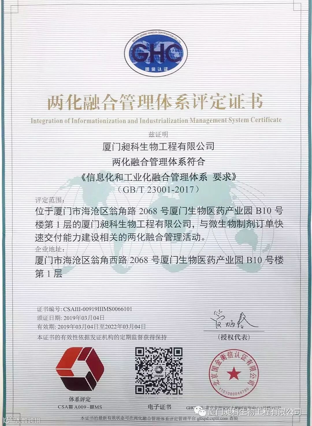 厦门昶科生物工程有限公司两化融合管理体系是由国家工信部颁布的标准,以ISO质量管理体系标准为基础,将工业化和信息化深度融合,集中精力发展研发、设计、销售、管理等产业链环节,实现高端环节产业的快速增长,帮助企业建立一套两化融合的管理体系。自2017年以来,在公司领导的大力推行倡导下,咨询公司于2018年3入驻公司,对企业现场进行评估调研,对高层及各部门主管进行深入访谈及交流。通过各部门紧密配合和努力付出,完成了两化融合管理体系新型能力规划及落地的管理体系文件清单策划工作。