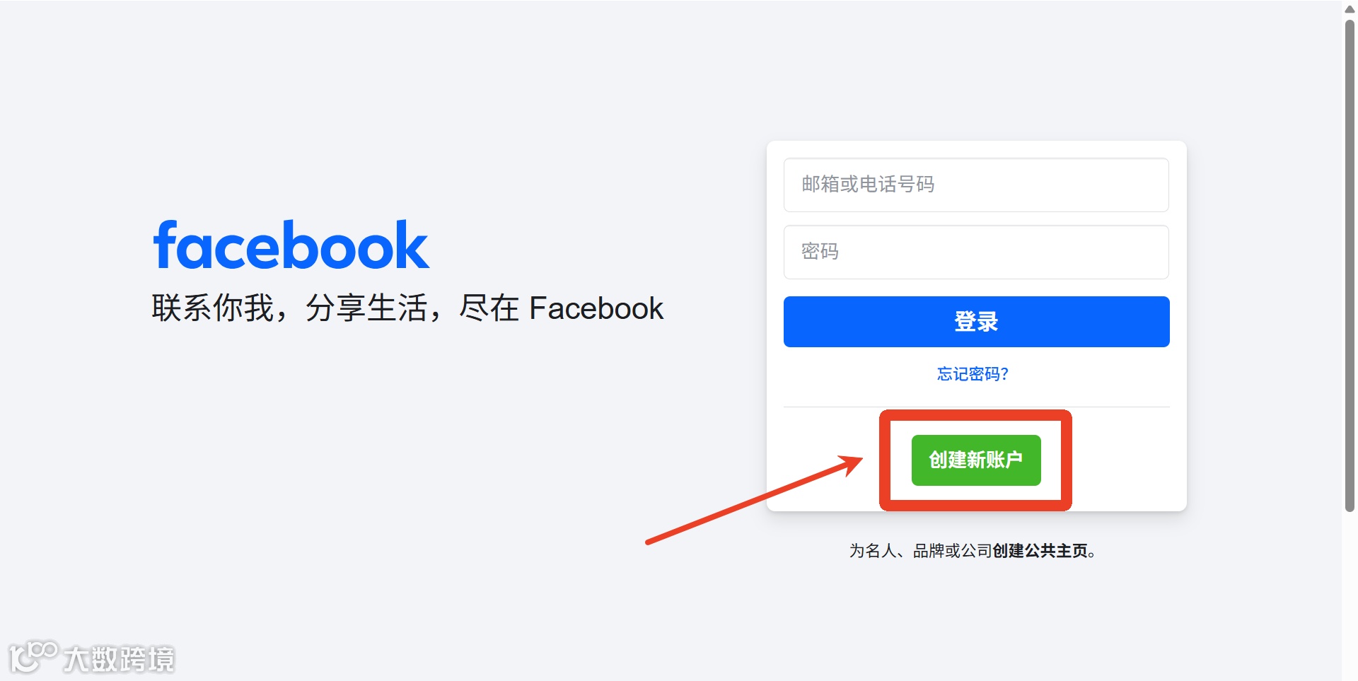 ① 打开 Chrome、Firefox 等主流浏览器,进入 Facebook 官方网站(facebook.com),在登录页点击【创建新账户】。