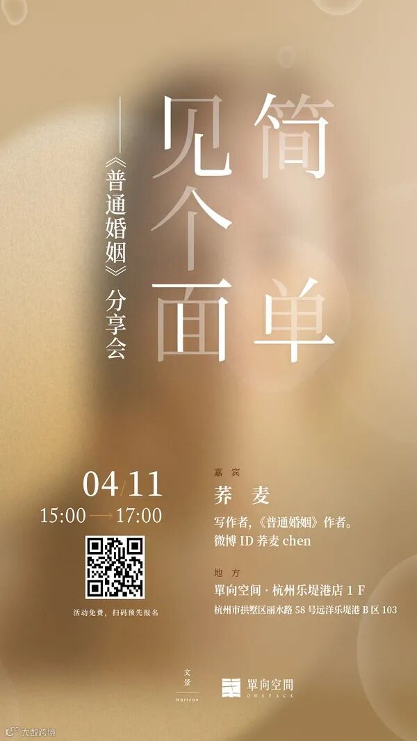 这是一个曾经以为婚姻是正确答案的女性的自我发现之旅。是在时代的阴差阳错下,一个女性如何在迷惘和挫折中渐渐习得了自由。荞麦将做客单向空间·杭州乐堤港店,与读者简单见个面,聊聊小说和生活。