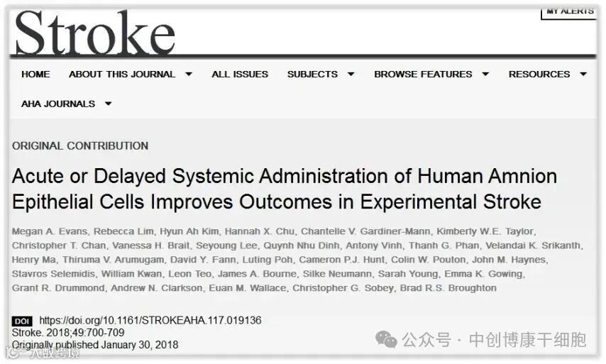 2018年7月30日,据新华社悉尼报道,澳大利亚等国研究人员的最新研究发现,为中风患者靶向使用人体羊膜干细胞(胎盘羊膜干细胞的一种)可有效减少脑部损伤,同时有助于患者恢复。研究成果已发表在美国《Stroke》杂志上。