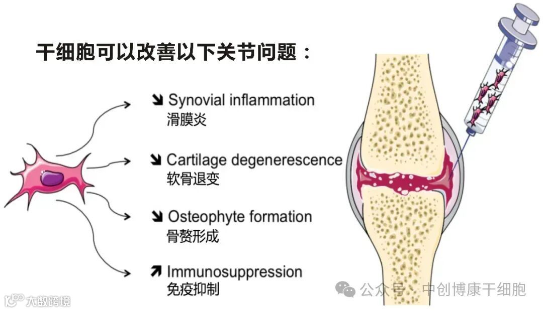 干细胞可以转化成许多不同类型的特殊细胞,新生软骨细胞,分泌多种生物活性分子,具有调节免疫和抗炎作用。这些特点可减轻和缓解骨关节炎的临床症状,改善关节炎患者的软骨缺陷,提升修复效果的同时也降低了患者在临床修复过程中的痛苦和副作用。