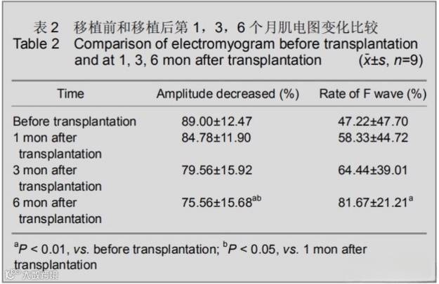 移植后肌电图呈现改变,复合肌肉动作电位波幅好转,F波引出率增加,主要是第3个月以后改善明显,移植前与移植后6个月比较复合肌肉动作电位波幅改善最为显著,F波出波率表现类似,见表2。