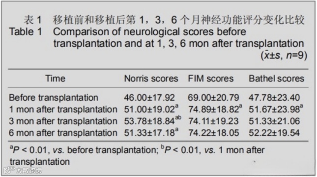 方 法:研究者共入选ALS患者9例,年龄32~65岁,男6例,女3例,平均(53.1±11.7)岁。病史8个月~3年,平均1.79年。将干细胞通过蛛网膜下腔植入患者体内,术后平卧3 d。所有患者均在移植前和移植后第1、 3、6个月进行Norris肌萎缩侧索硬化量表评分、功能独立性评定量表(FIM)、Barthel指数评定。
