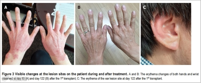 干预后:第1次移植后7天,双手红斑略有减少,尤其是手腕周围(图3A),瘙痒也有减少。自第1次移植后红斑逐渐消失,到122天红斑基本消退。最终两只手均未观察到红斑(图 3B),耳朵的红斑也明显减少。