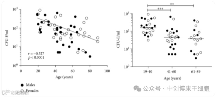 2019年,英国利兹大学的科研团队采集了67名健康供体(19-89岁)的骨髓间充质干细胞,通过体外培养的方式证实了:年轻人的干细胞数量和增殖能力显著高于老年人。[2]