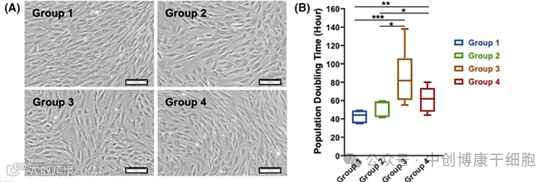 健康组(第1组)和2型糖尿病患者的自体骨髓来源间充质干细胞(BM-MSCs)的表征对比(糖尿病持续时间:第2组:<5年,组3:5-10年,第4组:>10年)