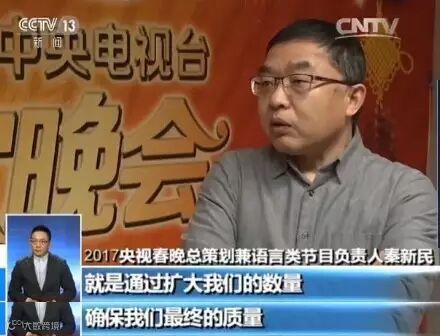 2017央视春晚总策划兼语言类节目负责人 秦新民:我们今年确立的一个战略,就是通过扩大我们的数量,确保我们最终的质量。语言节目的创作上,我们组织了超过以往任何一届春晚的编创队伍。