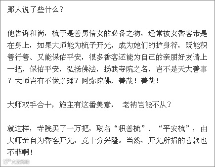 第五个人:也来到一个寺庙卖梳子,和尚说,真的不需要的。那人对和尚说,你是得道高僧,书法甚是有造诣,如果把您的字刻在梳子上,刻些“平安梳”、“积善梳”送给香客,是不是既弘扬了佛法,又弘扬了书法,老和尚微微一笑,无量佛!就买了1000把梳子。