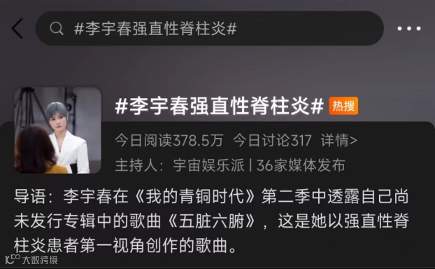 歌手李宇春曾在参加访谈节目《我的青铜时代》时,首次公开披露了自己患上强直性脊柱炎的病情,在当时病痛最严重阶段甚至到了无法安睡、必须依赖轮椅的程度。这一消息迅速引发了公众关注,并登上了热搜榜单。