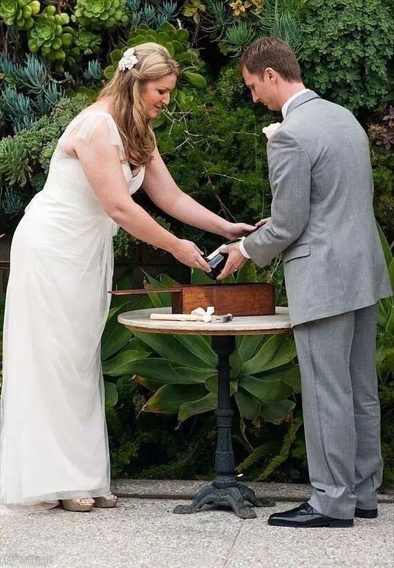 婚礼当天,把彼此的誓词和红酒封在盒子里,如果有一天,你们吵架甚至要离婚的时候,一起打开盒子,各自倒上一杯红酒,去不同的角落,喝着红酒读着对方当时写的誓词,回想起结婚时那份甜蜜,记起彼此之间的那份感情...