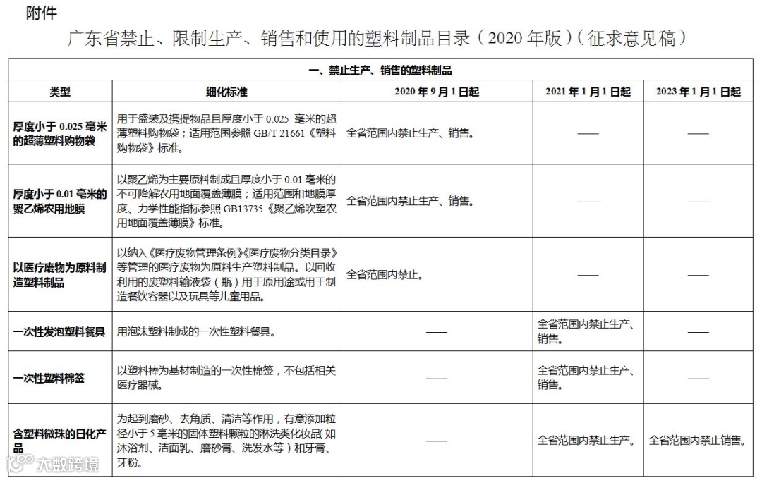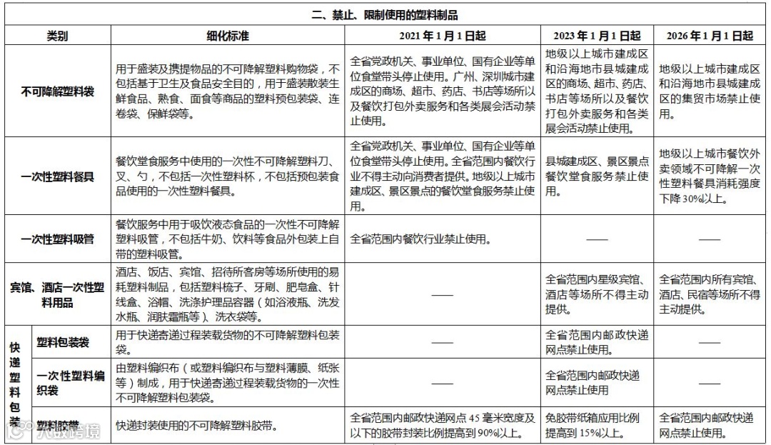 为便于各地执行《省实施意见》,省发展改革委、省生态环境厅制定了《广东省禁止、限制生产、销售和使用的塑料制品目录(2020年版)》,明确了相关禁限细化标准、区域范围和时间节点。