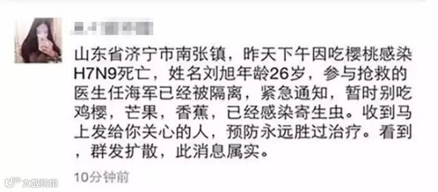 谣言:有人因吃樱桃感染H7N9病毒死亡,参与抢救的医生已经被隔离。
