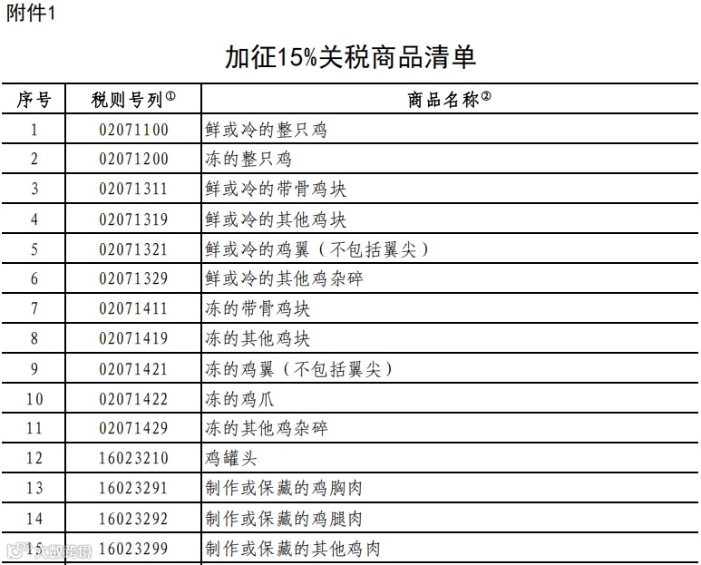 此前,3月10日起,中方对原产于美国的鸡肉、玉米等农产品征收15%关税,对高粱、大豆、猪肉、牛肉、水产品、水果、蔬菜、乳制品加征10%关税。