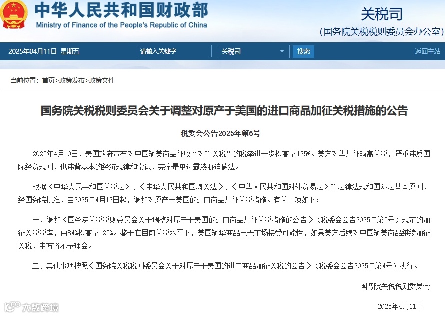 一、调整《国务院关税税则委员会关于调整对原产于美国的进口商品加征关税措施的公告》(税委会公告2025年第5号)规定的加征关税税率,由84%提高至125%。鉴于在目前关税水平下,美国输华商品已无市场接受可能性,如果美方后续对中国输美商品继续加征关税,中方将不予理会。