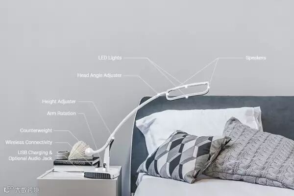 支撑架的尾部内置扬声器和LED照明灯