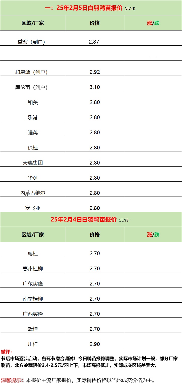 白羽肉鸭毛鸭节后调整状态,较节前常规弱态,规模冷藏逐步开工启动中,市场成交小,弱态调整中。