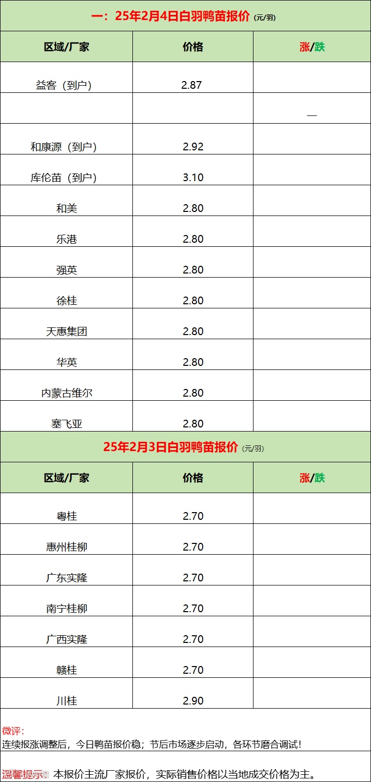 白肉肉鸭毛鸭春节假期中,规模冷藏开工较少,市场代表性报价暂无。