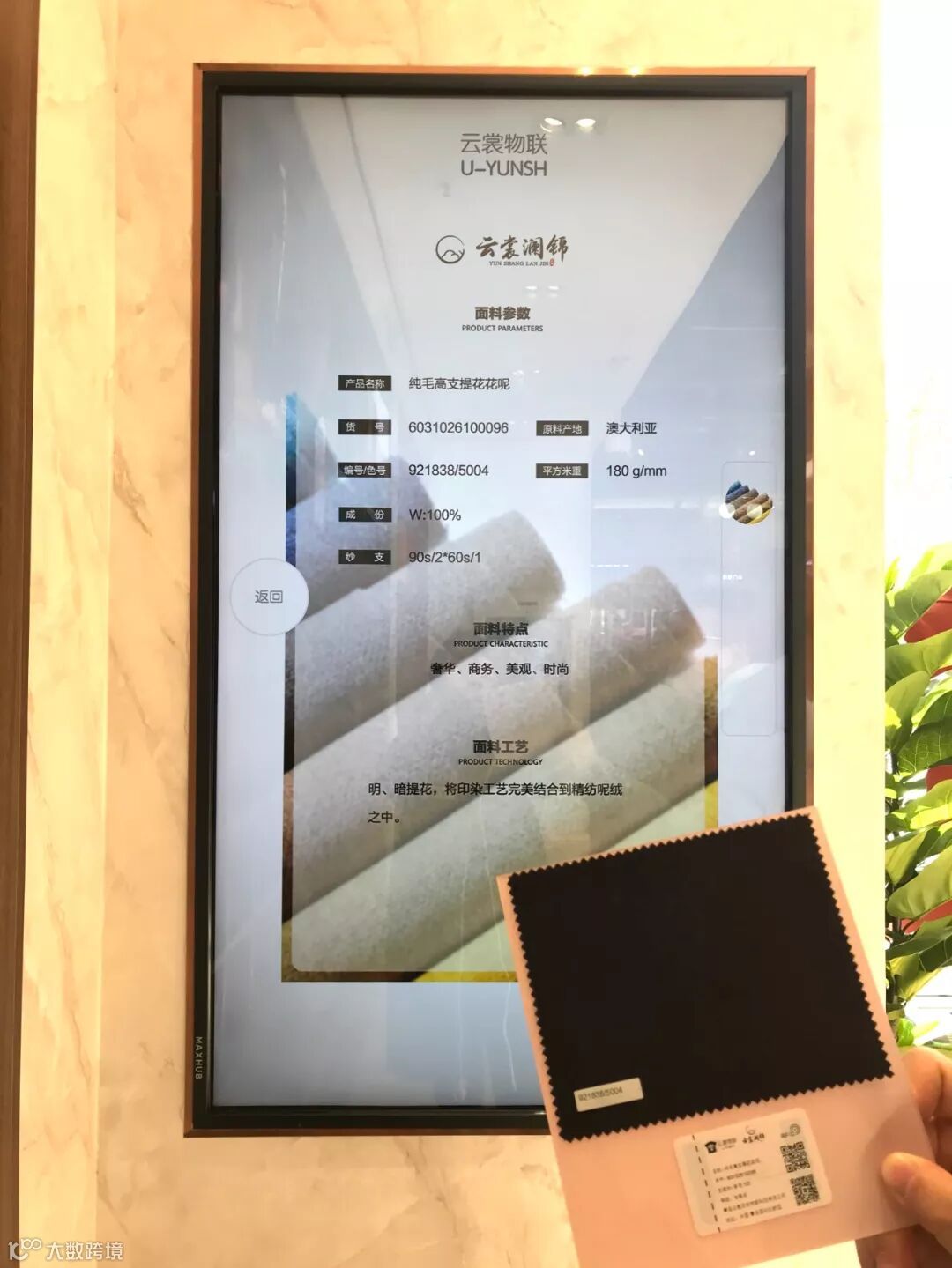 RFID溯源通过RFID技术读取商品的详细信息,顾客可以通过55寸智能触控屏,进行自助操作,查看产品的详细信息,线上下单等。