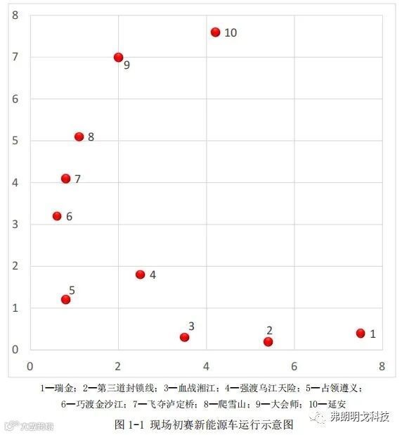 新能源车现场决赛时, 除固定点外, 结合长征故事,现场决赛的场地大小、 所设置的打卡点及数量与现场初赛有所不同,而且要有模拟长征情景的打卡点数 量,其打卡点及数量、模拟长征情景的打卡点及数量现场决定。现场初赛和决赛,每次运行时,出现错序打卡、重复打卡现象,则本次现场运行结束。