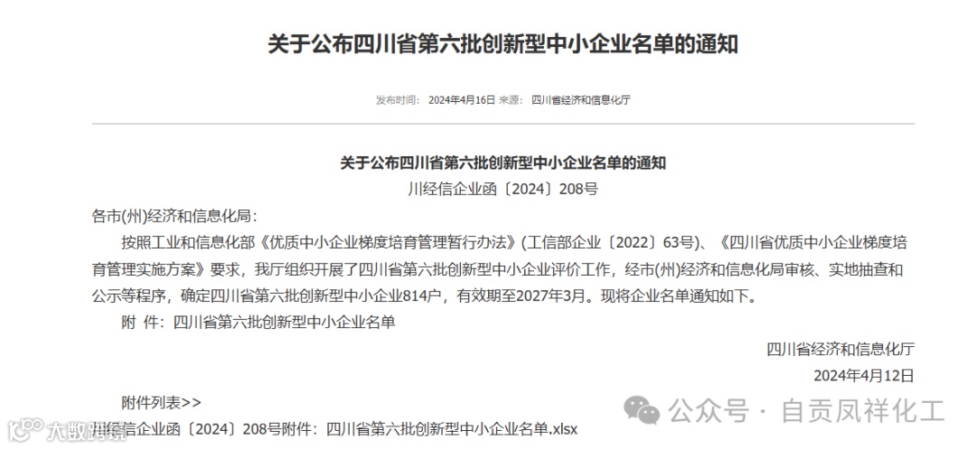 日前,四川省经济和信息化厅发布了四川省第六批创新型中小企业名单,其中沿滩高新技术产业园区内的自贡市凤祥化工有限公司榜上有名。
