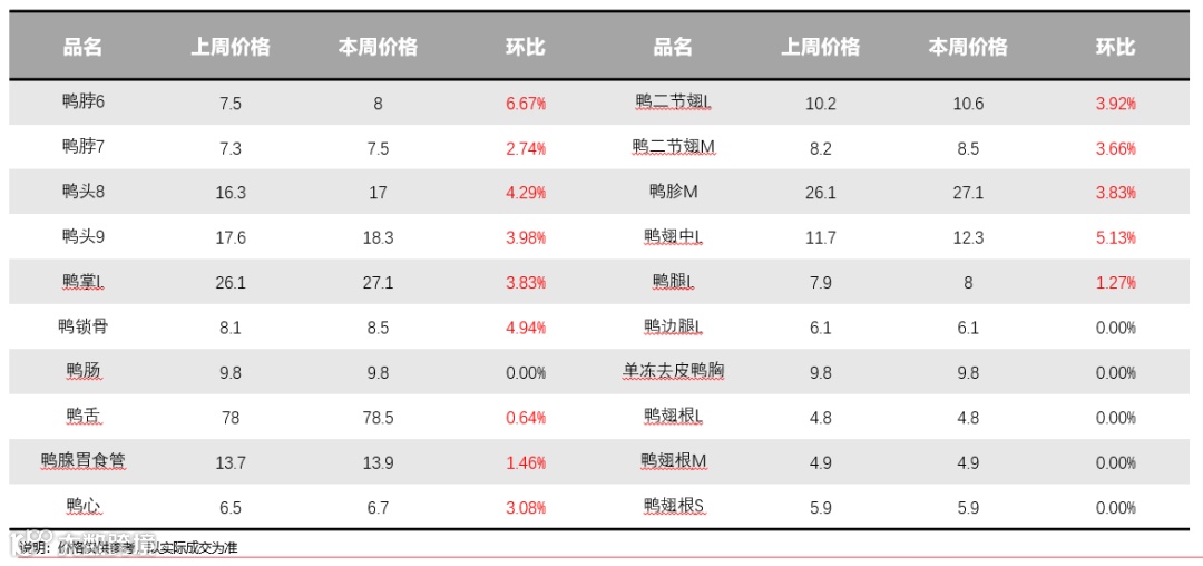 未来走势预测说明:鸭产品产业链上游各环节涨跌不一,鸭苗、毛鸭均为下跌,种蛋、分割品价格上涨;虽然市场走货一般,采货价延续低位,批量订单持续偏少,原料需求尚未有明显增量,行情仍以震荡上行趋势为主。