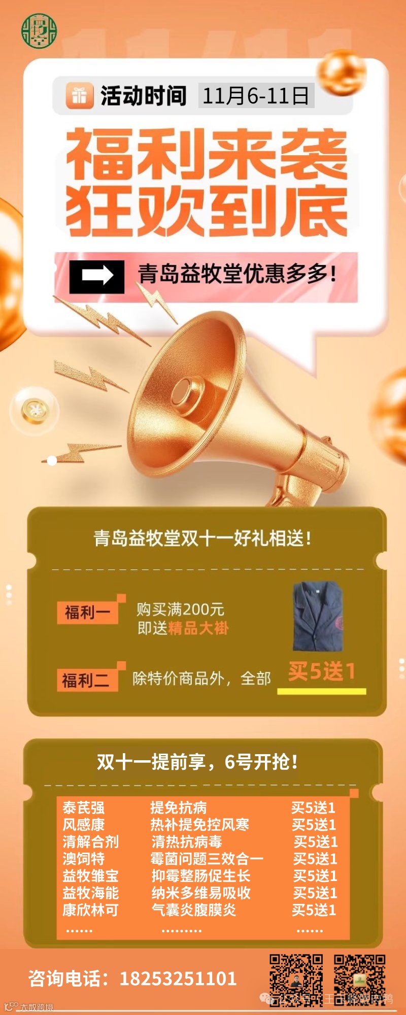 一年一度的双十一特价享已经到来,气温下降,热度不降!益牧堂双十一优惠活动开始了,除特价商品外,全场买五送一,力度空前!购买产品200元以上,还加送超厚超耐磨工作大褂一件,养殖朋友们机会难得,一定要抓住优惠,薅一波羊毛!