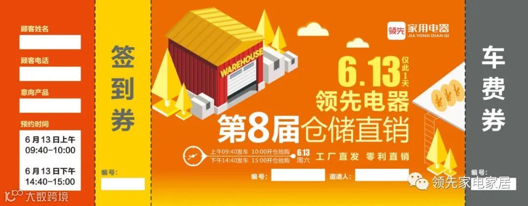 顾客凭“仓储门票”6月13日到领先仓储物流园区开仓抢购仓储产品,消费满2000元,送抽奖1次;