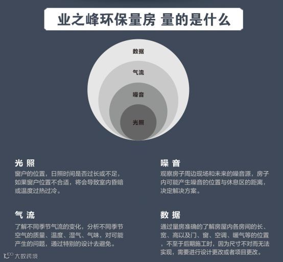 通过现场量房,设计师可仔细地观察房屋的位置、朝向以及周围的环境状况、噪音是否过大、空气质量如何、采光如何等,同时遵循业之峰独有的环保设计八大体系“声、光、水、气、材、色、形、风”来预判房屋的设计方案是否存有漏洞,从而通过设计来弥补不利的环境因素。