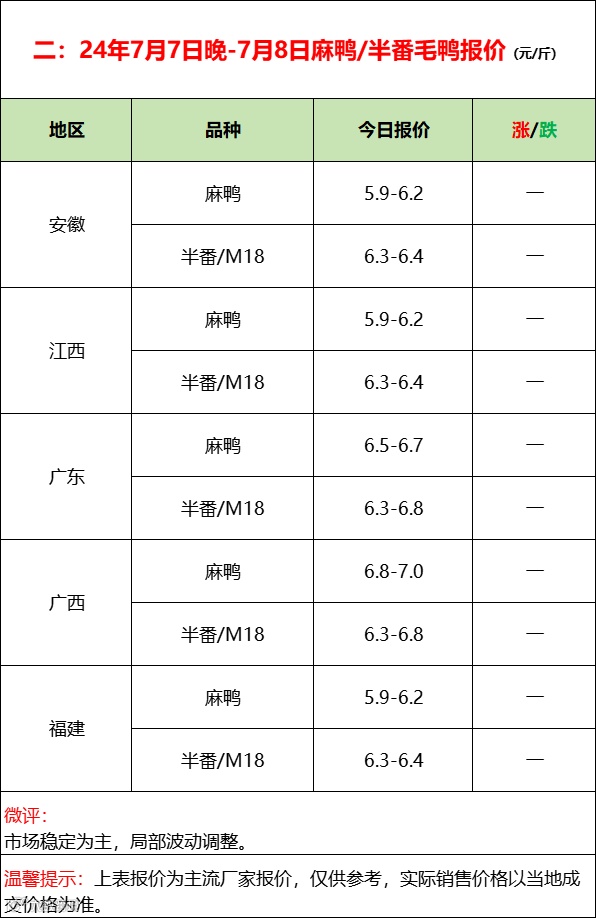 鸭苗局部上涨,市场反馈一般;--2024年7月8日水禽行情简报
