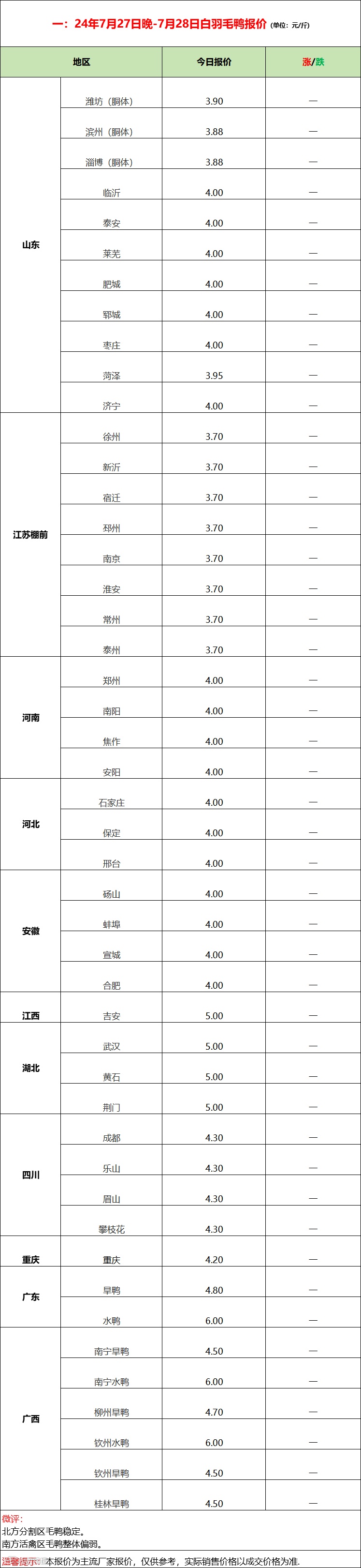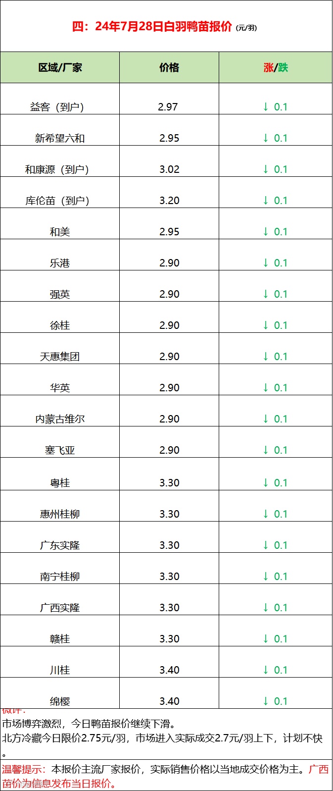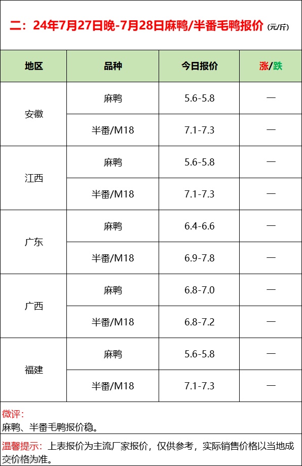 鸭苗继续限价成交实低;产品涨势放缓走货为主;--2024年7月28日水禽行情简报