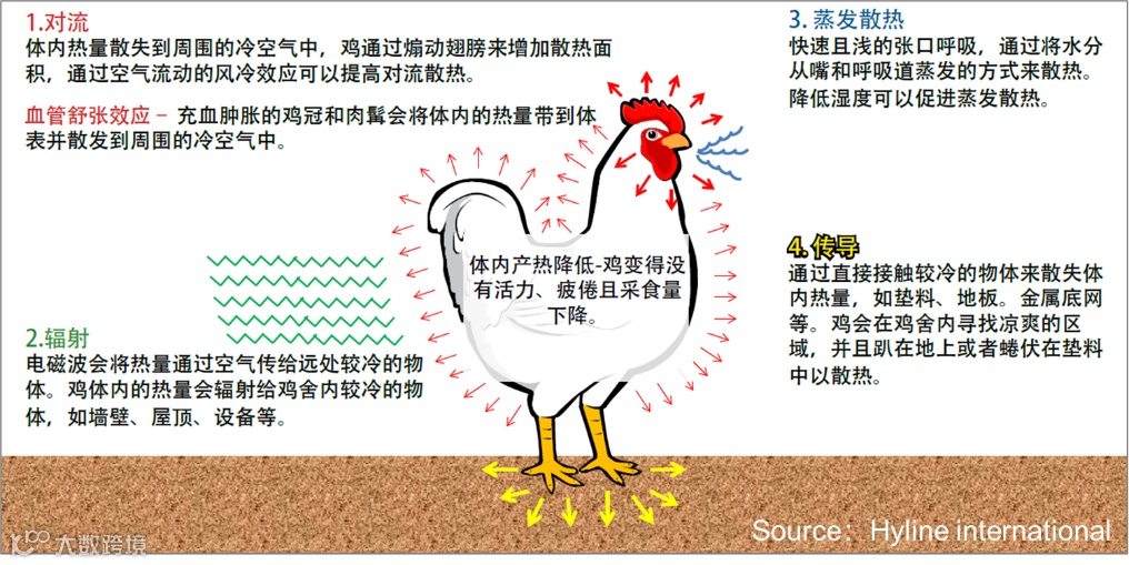 显热散热很容易理解。鸡的体温高于周围空气的体温所以热量会散发到周围空气中。周围空气