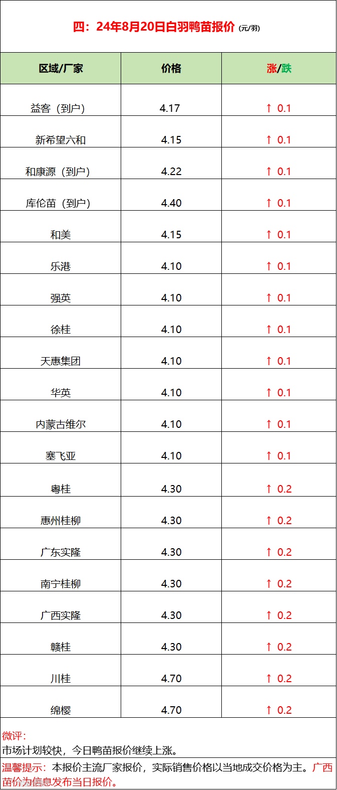 苗蛋继续上涨,产品持续疲软!--2024年8月20日水禽行情简报 益牧堂水禽信息