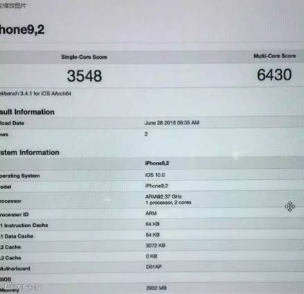 图中展示了iPhone 7系列的性能跑分,显示该机内置3GB内存,和此前的传闻基本一致。同时,我们还看到其搭载的处理器A10主频为2.37GHz,依然是双核心设计。而GeekBench跑分成绩也非常不错,其单核跑分为3538,多核跑分成绩6430,甚至将骁龙820都甩在身后。