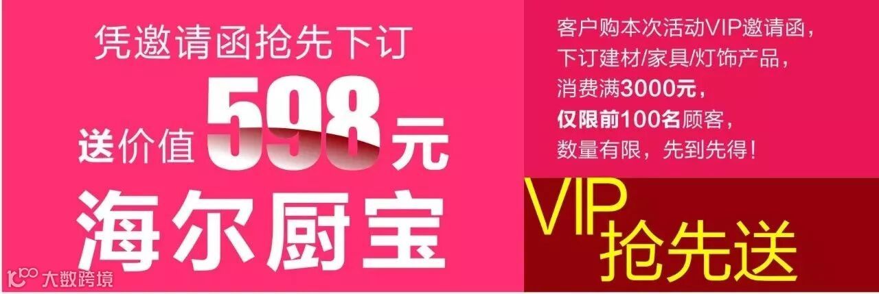 客户购VIP邀请函,下订建材家具灯饰产品,消费满3000元送价值598元海尔厨宝一个,仅限前100名顾客,数量有限,先到先得!