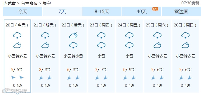 乌兰察布市气象台2017年3月17日17时发布预报信息:受西来槽持续影响,下周我市多雨雪天气过程。预计20日全市有小到中雨或雨夹雪,南部地区偏大;22日至24日全市还将有明显降水天气过程。下周全市气温呈缓慢下降趋势,过程降温在6~8℃。建议农牧业、交通等相关单位提早做好应对措施;同时提醒各旗县气象局做好预报预警服务工作。