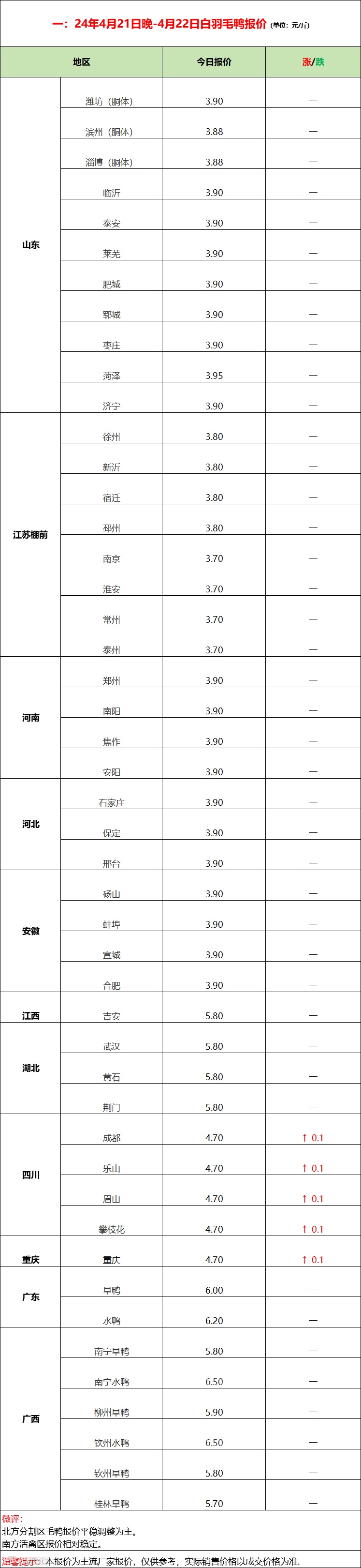 今日北方毛鸭波动调整,冷藏屠宰合同为主,市场交易一般;南方水旱鸭涨后持稳。产品端走货一般,消费端表现平淡。